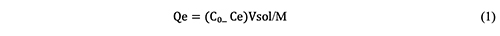 where Qe (mg/g) is the equilibrium adsorption capacity, C and Ce are the beginning as well as equilibrium concentrations of Cibacron red dye, and M is the mass of the CeO2 nanoparticles (g). V sol is therefore the volume of Cibacron red (L).