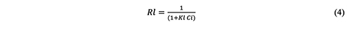 The Langmuir constant is Kl (mg/L), but the maximum adsorption of Cibacron red dye is q max (mg/g). The separation factor, often known as the dimensionless constant (Rl) [36], outlines and illustrates the main features of the Langmuir isotherm: