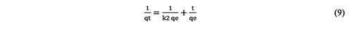 The pseudo-second-order kinetic model is as follows, as seen in [10-12]: