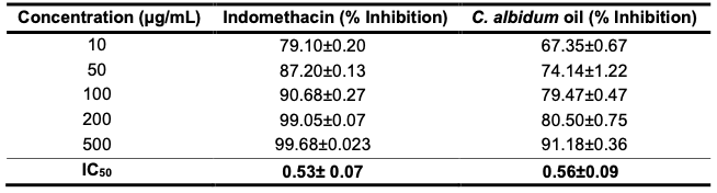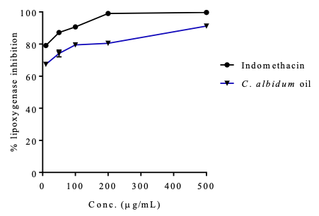 Lipoxygenases (LOXs) are important enzymes that convert arachidonic acid, linoleic acid and other polyunsaturated fatty acids into bioactive metabolites that are responsible for inflammatory and immune responses. These enzymes are key in the biosynthesis of leukotrienes and play vital roles in several inflammation-related diseases, such as cancer, allergic reactions, asthma, colitis ulcerosa, rheumatoid arthritis, and psoriasis [31-34]. The inhibition of leukotriene biosynthesis via the LOX pathway with natural products may have occurred by potential therapeutic means. The anti-LOX activity (anti-inflammatory activity) of the seed oil of C. albidum was determined and compared with a standard drug, indomethacin, following a standard procedure already described. A dose response activity comparable to that of the standard drug was obtained (Table 5 and Figure 1).