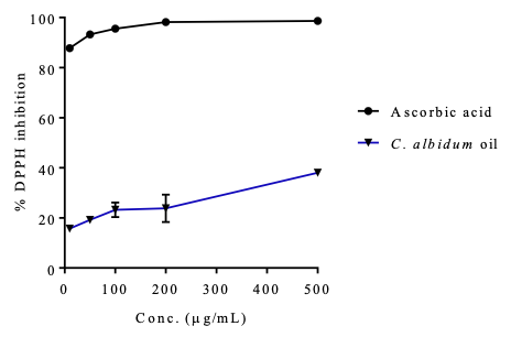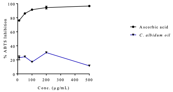The anti-LOX activity (anti-inflammatory activity) of the seed oil of C. albidum has a dose response activity comparable to that of the standard drug (indomethacin). The DPPH dose–response scavenging action of the oil (IC50 = 4.74±0.83 µg/mL) is lower than the activity observed in the standard, ascorbic acid (IC50 = 0.34±0.04 µg/mL), while in ABTS analysis the oil extract shows a significant activity higher than the ascorbic acid. The different in the antioxidant activities is due to different mechanism of action of the assay.