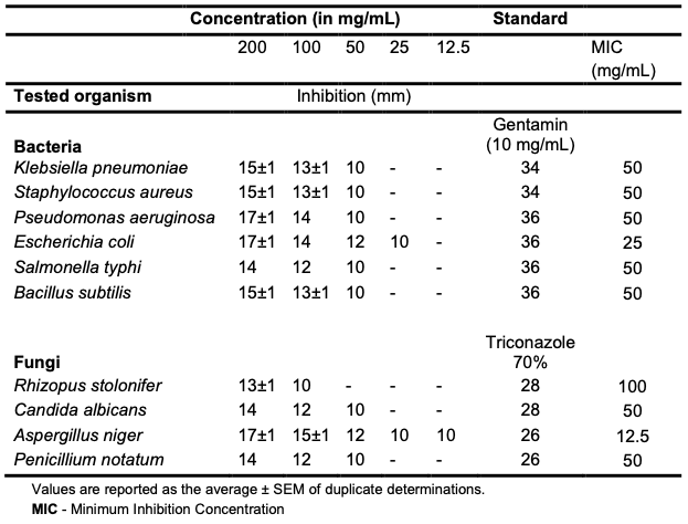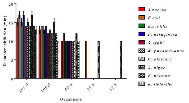 The oil exhibited appreciable inhibition (200 mg/mL) of the growth of all the test organisms (Table 8 and Figure 4). E. coli, P. aeruginosa and A. niger at 200 mg/mL exhibited the highest antimicrobial sensitivity (17±1 mm) to the C. albidum seed oil, while R. stolonifer exhibited the lowest sensitivity (13±1 mm).