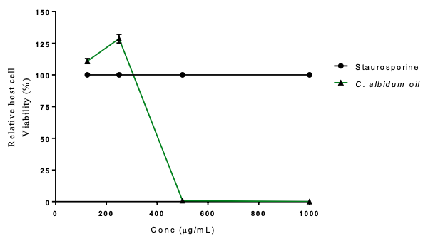 The in vitro cytotoxic potential of C. albidum oil on HFF mammalian cells was determined. The cellular toxicity (Table 9) was lowest at 250 µg/mL, with cell viability (128.64%), while at 1000 µg/mL, cell viability was 0.03%. As shown in Figure 5, C. albidum revealed dose-dependent cytotoxic activities against HFF cells. Dégbé et al. [40] demonstrated the low cytotoxic effect of an ethanolic extract of Vernonia amygdalina on mammalian cells as well as moderate antioxidant properties.