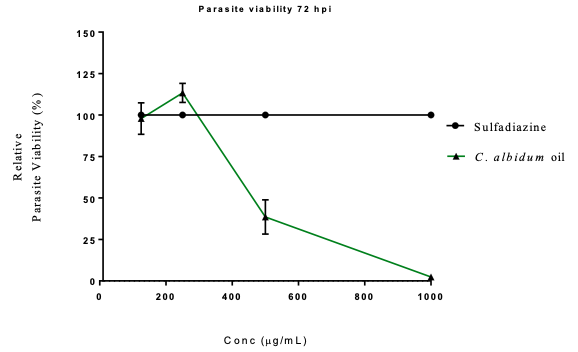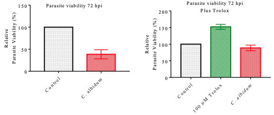 Following the establishment of the parasite inhibition potential of the oil, we sought to determine the likely mode of antiparasitic action. Therefore, we investigated the culpability of ROS in the inhibition potential by the inclusion of Trolox, an antioxidant at a concentration of 100 µM, in the screening.