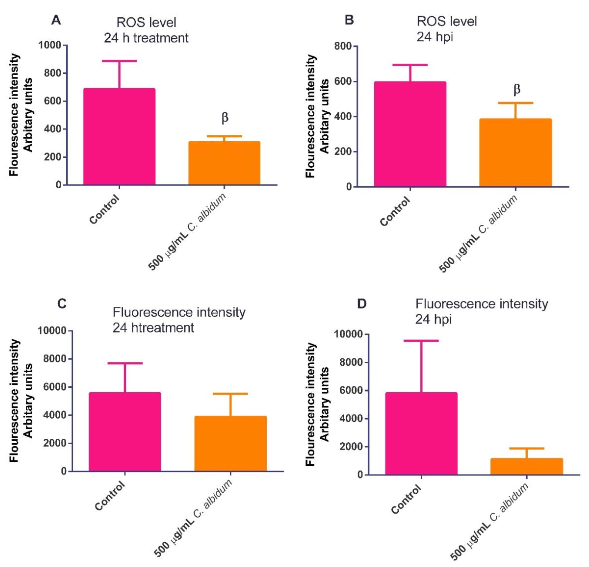 As seen in Figure 7a-b, the Trolox inclusion in the screening assay induced a significantreduction in the inhibition potential. The results obtained for ROS analysis revealed that the C. albidum oil did not boost the ROS secretion both at the inclusion and exclusion of T. gondii infection (Figure 8a-b). In contrast, C. albidum oil impaired the fluorescing capacity of the cellular mitochondrial membrane both when T. gondii infection was absent (Figure 8c) and present (Figure 8d). The emerging observation is suspected to be a result of T. gondii infection leading to the disruption of the physiological integrity of cells.