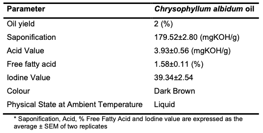 The C. albidum seed afforded (via Soxhlet extraction) an oil yield of 2% of the total weight of the seed material, of which 95% was trans-esterifiable. The physicochemical parameters of the oil determined following standard procedures are shown (Table 1).