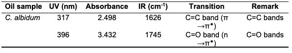 The seed oil has an acid value of 3.93±0.56 mg/KOH/g (Table 1). Low acid values in oil correspond to relative stability with attendant resistance to rancidity and peroxidation. However, a low acid value is also associated with the presence of phenolics and antioxidants [4,27]. C. albidum had a relatively low free fatty acid value of 1.58±0.11 (Table 1).