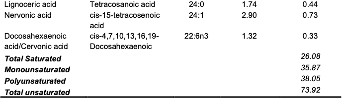 The oil has a saponification value of 179.52±2.80 mg KOH/g (Table 1). The high saponification values exhibited by this oil suggest that the oil will offer promising benefits in cosmetic and personal care products [24,25]. A high concentration of short-chain fatty acids has been implicated in fats and oils with high saponification value [26].