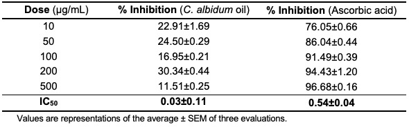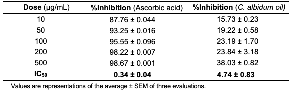 For the evaluation of the free radical scavenging capacity of the C. albidum seed oil, two antioxidant assays (DPPH and ABTS) were adopted. Precisely, the oil showed a DPPH dose–response scavenging action (IC50 = 4.74±0.83 µg/mL), which was lower than the activity observed in the standard, ascorbic acid (IC50 = 0.34±0.04 µg/mL), as depicted in Table 6 and Figure 2.