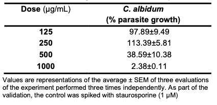 T. gondii, a common protozoan parasitic agent responsible for toxoplasmosis, is known to possess the capability to infect nearly all warm-blooded animals [17,18]. In more than the 1 billion human populations that it infects, it often has lethal outcomes in pregnant women, although it is asymptomatic in other healthy individuals. T. gondii human infection occurs through the consumption of uncooked or improperly boiled infected meat [41,42]. In this study, C. albidum exhibited concentration-dependent activities against T. gondii parasite growth (Table 10). Precisely at 125 and 250 µg/mL, the oil had 97.89% and 113.39% parasite growth, respectively (Figure 6).