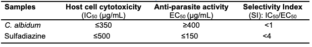 To determine whether the inhibition of T. gondii growth by C. albidum oil was a result of specific or general toxicity, the selectivity index (SI) of the sample was estimated by calculating the ratio of the cytotoxicity (IC50) in mammalian cells to the antiparasite activity (EC50). As shown in Table 11, the SI (<1) of C. albidum was found to be lower than that of the standard drug sulfadiazine (<4). While the C. albidum oil showed good inhibition potential against T. gondii growth, it could not exhibit satisfactory selectivity toward the parasite versus the host cells. The results obtained in this study revealed that the inhibitory activity of the C. albidum seed oil was due to general cellular toxicity or by an underlying antiparasitic mechanism beyond the scope of the present study.