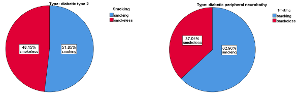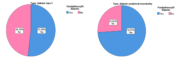Figure 1 shows that most of this study's participants were smokers, 62.96% and 51.85% for DPN and T2DM, respectively. Furthermore, the family history of disease results were 74.07% and 51.58% for DPN and T2DM, respectively [25]. Identification of independent risk factors for diabetic neuropathy progression in patients with type 2 diabetes mellitus. Journal of International Medical Research who had a family history of disease. Other research reported that in every category studied, sick people were much more likely to have a significant history of diabetes and complications such as “DPN”. The family history of diabetes and major complications were associated with peripheral neuropathy [26,27].
