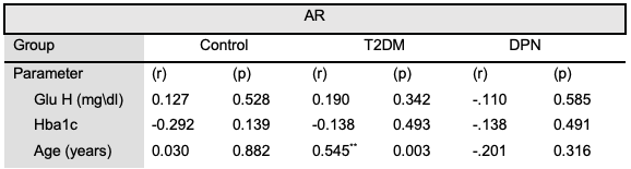 The results in Table 3 with Figure 4 show that the AR had a strong positive correlation with Age (years) (r= 0.545**) (p= 0.003) in the T2DM group, however, with a moderate “positive correlation” with hypertension (r= 0.425*) (p= 0.027) and a strong “negative correlation” with BMI in control group (r = -0.554**) (p= 0.003).