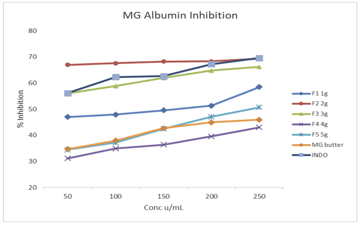 Different variety cream blends were produced and screened from Magnifera indica L. seed butter for their potential to reduce skin inflammation when used as body cream from their albumin-denaturation inhibition activity. When administered as a cream, F2 cream showed superior efficacy in reducing skin inflammation compared to the control, indomethacin. The efficacy of the F3 and F1 creams was comparable to the standard indomethacin. This suggests that Magnifera indica L. seed butter is a viable alternative as a base oil in body cream production. Its use will reduce year-round seed waste and improve the community's economic activities with good mango tree reserves.