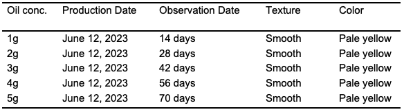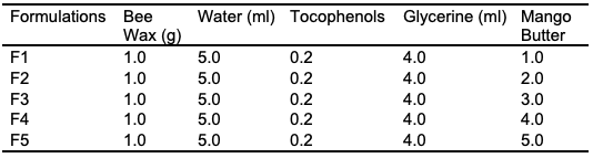 The cream was formulated using bee wax as the emulsifier, tocopherols, water, and glycerine. Bee wax was heated with tocopherols, water, and glycerine in a beaker using a hot plate before adding the mango butter. The experiment was replicated using varying quantities of mango butter seed oil. We transferred the concoctions into various receptacles to solidify and preserve them (Table 1). The products underwent a stability test and evaluation for a duration of 70 days.