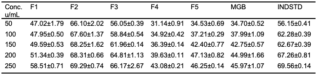 Table 4 gives the fatty acid composition of the seed oil. Oleic acid accounts for a large percentage of the seed oil at 35.715%, followed by palmitic acid (29.365%) and stearic acid (25.397%). The oil shows a high degree of saturation (54.762%), which may explain why it is solid at room temperature (26-28ºC). Oleic acid, which is the most abundant fatty acid in the seed oil, has been reported for its ability to enhance smoothness and softness of the texture as well as maintain skin moisture [17,18]. The oil may have consistently demonstrated a smooth texture throughout the 70-day stability test periods due to its presence. The ability to prevent the denaturation of albumin is a good indicator of anti-inflammatory action. It is a good quality for a cream to have a mild ability to reduce inflammation on the skin. The bioactive principles in seed oil often confer the same medicinal properties on the products; research by [15] shows seed oil products often retain their pharmacologic properties, hence why the prepared oil was screened for their anti-inflammatory properties.