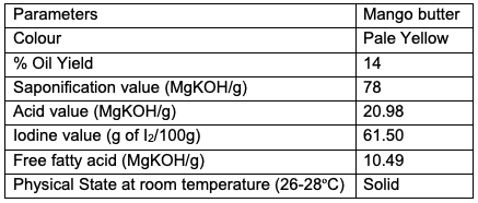 The physicochemical characteristics of different formulated creams made from Magnifera indica seed butter are shown in Table 2. As shown in the table, the seed has a moderate oil yield of 14%. The low yield suggests blending the oil with other oils for cream production. The low saponification value of 78 mgKOH/g indicates its low ability to be used in soap making and justifies its use in cream making. The low saponification value can also be attributed to the presence of higher molecular weight fatty acids (this was confirmed in Table 4, showing the fatty acid composition of the seed oil). The presence of docasadienoic acid contributes to the obtained low saponification.