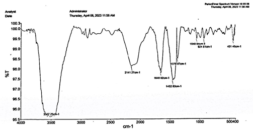Then, a band was obtained at 2141.27 cm-1 due to presence of group C-C triple bond stretching. At 1649.02 cm-1, a band was obtained which showed the presence of C=O stretching (Ϩ-lactum). At fingerprint region, in between 1500-667 cm-1, we obtain the bands of 1452.8 cm-1, 1370.87 cm-1, 1048.84 cm-1 and 924.8 cm-1, which are present due to C-H bending of alkane, C-H bending of aldehyde O=C-O-C=O anhydride stretching group and trans=C-H out of plane bending group.