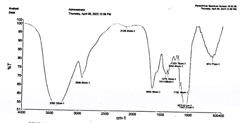 In the IR analysis of the mushroom powder, we found a band at 3382 cm-1 which shows the presence of a H-bonded alcohol stretching group. Further, the obtained bands at 2926 cm-1, 2128 cm-1 and 1650 cm-1 depict the presence of aldehyde group having C-H stretching, C=C stretching in ring, and C=C stretching in alkenes, respectively. The bands situated at 1373 cm-1 and 1414 cm-1 show the presence of nitro stretching and sulphate stretching. We also found the bands at 1250 cm-1, 1203 cm-1, 1152 cm-1 and 574 cm-1 that show the presence of C-O stretching, tertiary saturated alcohol, C-O stretching and C-H bending in aromatic compounds, respectively. Some bands were also obtained at 1079 cm-1 and 1043 cm-1, which shows the presence of secondary alicyclic five or six membered ring. The IR analysis of the enzyme is shown in Figure 2.