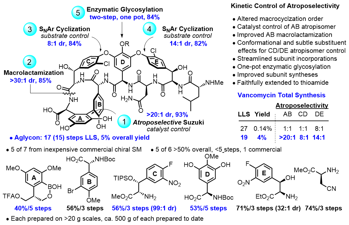A long-standing program has focused on the total synthesis and evaluation of naturally occurring biologically active cyclic peptides. The most recognized of the efforts are the total syntheses of naturally occurring glycolpeptide antibiotics including vancomycin and its aglycon, teicoplanin, ristocetin and ramoplanin aglycons, chloropeptin I and II, and the complestatins [10]. Along with these studies, we rationally redesigned the structure of vancomycin to achieve dual binding to both D-Ala-D-Ala and D-Ala-D-Lac, altering a single atom in the binding pocket such that it remains active against vancomycin-sensitive bacteria (e.g., MRSA), but is equally active against vancomycin-resistant bacteria (e.g., VRSA, VRE). The studies first defined the origin of the destabilized binding to the altered D-Ala-D-Lac target in resistant bacteria (100-fold derived from repulsive lone pair/lone pair interaction, 10-fold from lost H-bond) [11]. This led to the design and total syntheses of [Ψ[CH2NH]Tpg4]vancomycin and [Ψ[C(=NH)NH]Tpg4] vancomycin and their earlier aglycons, both of which displayed the dual ligand binding affinity and reinstated activity against vancomycin-resistant bacteria while maintaining activity against vancomycin sensitive bacteria. This was followed by the syntheses of peripherally-modified derivatives that we named maxamycins that: (1) contain a binding pocket and two synergistic peripheral modifications, (2) are endowed with three independent mechanisms of action only one of which is dependent on D-Ala-D-Ala binding, (3) display broad spectrum activity (e.g., MRSA, VanA/VanB VRSA and VRE) at remarkable potencies (MICs = 0.01 ㎍/mL), and (4) are durable antibiotics incapable of raising resistance in vitro and are potentially capable of extensive use for decades without fear of raising resistance [12,13]. With the discovery of the potent and durable activity of the maxamycins, α next generation total synthesis of vancomycin was developed that substantially improved synthetic access (Figure 1) [14].
