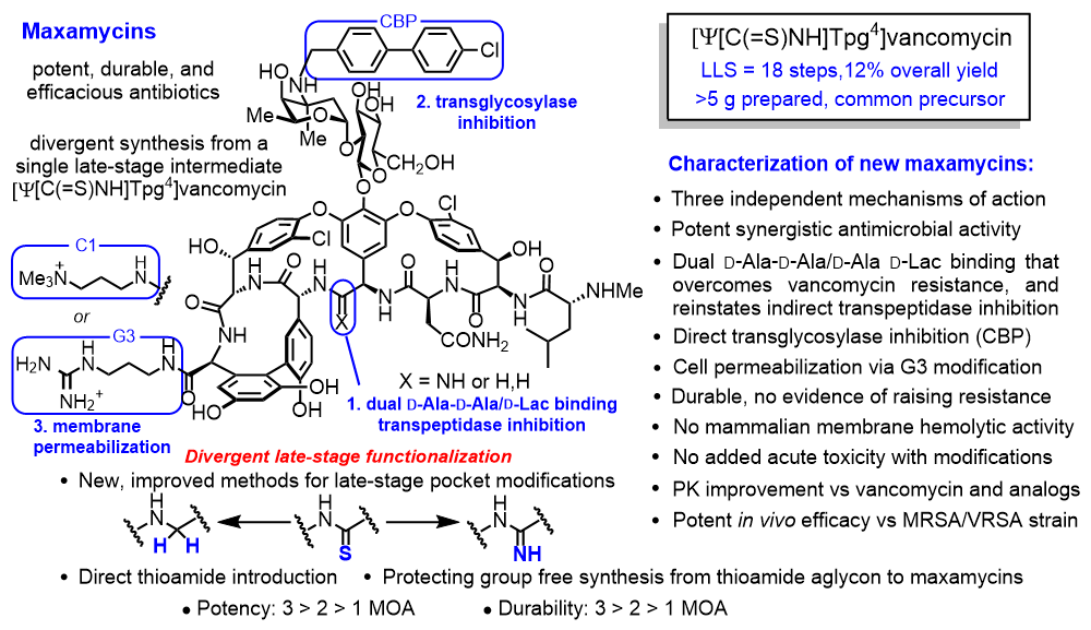 This divergent synthetic approach was subsequently further improved and implemented for the total syntheses of any maxamycin from a single late-stage intermediate, permitting traditional medicinal chemistry optimization on the complex glycolpeptide antibiotic [15]. The residue 4-thioamide of this late-stage intermediate, [Ψ[C(=S)NH]Tpg4]vancomycin, can be and was directly converted to any pocket-modified derivative that displays the dual ligand binding and paired with any combination of two different peripheral modifications, each introducing independent synergistic mechanisms of action without the use of protecting groups (Figure 2).