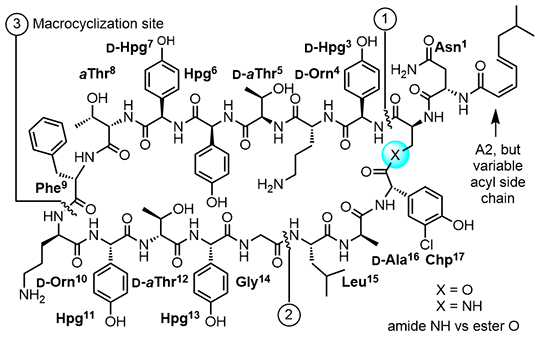 In the first such study, a prototypical maxamycin (G3,CBP-[Ψ[C(=N)NH]Tpg4]vancomycin) was shown to exhibit efficacious in vivo activity against the feared multidrug-resistant (MRSA) and vancomycin-resistant (VRSA) S. aureus bacterial strain (VanA VRS-2) for which vancomycin is inactive (Figure 3). Moreover, it was found that the C-terminus modifications (C1 and G3) offset the impact of hydrophobic vancosamine substitution, providing compounds with near ideal in vivo PK properties mitigating the short terminal half-life (0.5–1.3 h, t1/2), low exposure (AUC), inconsistent volume of distribution (Vd), and rapid clearance (CL) of vancomycin and the poor dose proportionality and problematic long terminal half-life of CBP-vancomycin [15]. A reduction in the complexity of the glycol-peptide structure through addition of two benign aryl chlorides that remove two synthetically challenging atropisomer elements (tetrachlorovancomycin [16] and the corresponding tetrachloromaxamycins [17]) permits an even more streamlined and scalable total synthesis and new opportunities for deep-seated core modifications. The ramoplanins are naturally occurring lipoglycodepsipeptides that are 2–10-fold more active than vancomycin against Gram-positive bacteria [18]. Ramoplanin A2 disrupts bacterial cell wall biosynthesis, inhibiting the intracellular conversion of lipid intermediate I to lipid intermediate II and the more accessible extracellular transglycosylase-catalyzed incorporation of lipid II into the glycan strand, steps that precede the site of action of vancomycin. Resistance to ramoplanin has not been detected, and cross resistance between ramoplanin and vancomycin has not been observed. Thus, it remains equally active against vancomycin-resistant organisms, in- cluding VanA/VanB VRE. Like vancomycin, ramoplanin acts by binding peptidoglycan precursors (lipid II > lipid I), sequestering these substrates from enzyme access, although the structural details of these interactions are not yet defined. In fact, ramoplanin embodies all the characteristics of vancomycin that contribute to its durability against resistance development. However, its instability derived from rapid depsipeptide hydrolysis precludes use for systemic infections and has limited its clinical exploration. Our development of the first and still only convergent total synthesis of the ramoplanin A1–A3 aglycons set the stage for its use in the preparation of key analogues. In these efforts, we demonstrated that synthetic [L-Dap2]ramoplanin A2 aglycon, which bears a linking amide in place of the sensitive depsipeptide ester in the backbone of the 49-membered macrocycle, is roughly 2-fold more potent ramoplanin A2 and its aglycon, and stable to 6 hydrolytic cleavage (Figure 4) [19].
