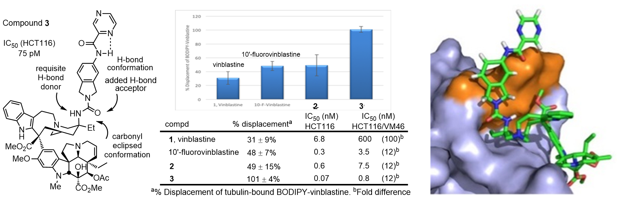 The discovery of vinblastine and its anti tumor activity led to the identification of tubulin as an especially effective oncology drug target [22]. Vinblastine binds at the tubulin α/β dimer−dimer interface where it destabilizes microtubulin assembly derived from the repetitive head-to-tail tubulin binding. Even by today’s standards, vinblastine and the related natural product vincristine are superb clinical drugs. They, and their biological target tubulin, remain the subject of intensive investigations because of their clinical importance in medicine, complex structures, low natural abundance, and unique mechanism of action. Following work that provided total syntheses of vinblastine and vincristine, our studies have probed the importance and role of the vindoline C16 methoxy group, C4 acetate, C5 ethyl substituent, C6–C7 double bond, and vindoline core itself, as well as the upper subunit C20’ ethyl substituent, C16’ methyl ester, and added C10’/C12’ indole substituents [23]. We defined the importance and anchoring role of the C20’ Et group and introduced the concept of “added benign complexity (ABC)” with an example that increased functional activity and tubulin binding affinity 10-fold. These and related studies showed that essentially every feature of the vinblastine core structure, every functional group and every substituent productively contributes to its properties. Unlike the removal of structural features or substituents that have a detrimental impact, the additions of new structural features not found in the natural product have been found that enhance target tubulin binding affinity and functional activity while simultaneously disrupting Pgp binding, transport, and functional resistance. Enabled by methodology that we introduced, a series of previously inaccessible vinblastine C20’ modifications were disclosed that display remarkable properties: 20’ ureas (30-fold increase in potency, reduced resistance due to Pgp efflux) [24], ultra-potent 20’ ureas (stunning 100-fold increase in potency derived from further disruption of the tubulin protein–protein interaction) [25], and vinblastine 20’ amides that completely overcome and mitigate resistance derived from Pgp overexpression and drug efflux (Figure 5) [26].