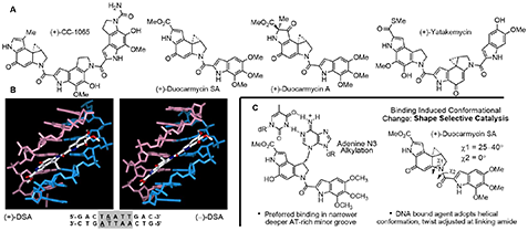 An early focus of our work targeted DNA binding, alkylation, and cleaving agents that exhibit antitumor activity [33,34]. These studies include work on a class of natural products composed of CC-1065, duocarmycin A and SA, and yatakemycin where we not only conducted total syntheses of each natural product [35–37], defining the absolute stereochemistry and correcting a misassigned structure (yatakemycin), but also characterized their DNA alkylation properties [38–42] (Figure 8).