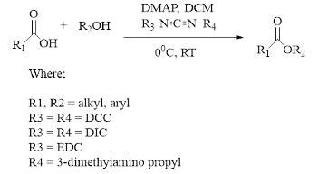 It is considered one of the most efficient methods for ester synthesis [15]. This reac- tion typically employs carbodiimide coupling reagents, such as N,N'-dicyclohexyl- carbodiimide (DCC), N,N'-diisopropyl-carbodiimide (DIC), and N-ethyl-N'-(3- dimethylaminopropyl)carbodiimide (EDC). For example, DCC reacts with a carboxylic acid in the presence of dimethylamino-pyridine (DMAP) to facilitate ester formation.