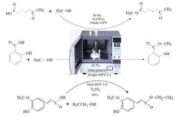 Microwave-assisted synthesis has proven effective for biodiesel production and has been successfully applied to the synthesis of esters like methyl levulinate, ethyl ferulate, and methyl salicylate, as shown in Figure 4. Esterification reactions using microwave irradiation can be conducted in various setups, including batch systems and continuous flow reactors [33].