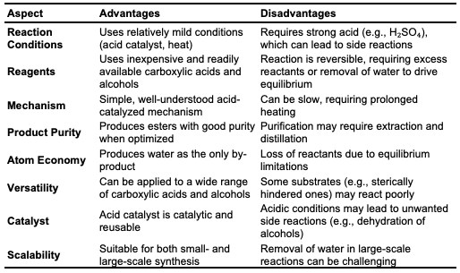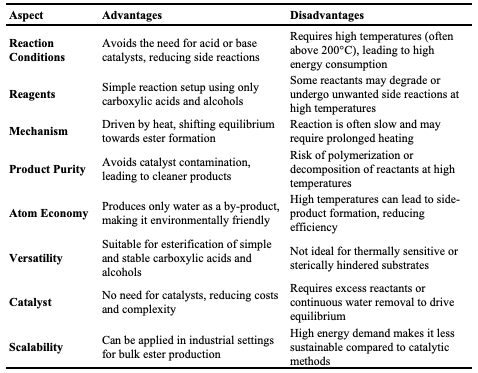 Non-catalytic thermal esterification offers several advantages, including the elimination of catalyst-related costs, reduced contamination, and fewer purification steps. These benefits are particularly valuable in biodiesel and fragrance production, where catalyst residues can complicate product quality. However, this method also has limitations, such as the need for high temperatures (often above 200°C), which increases energy consumption and can limit reaction rates, particularly with bulky or less reactive substrates [6].