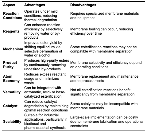 Membrane technology has gained significant attention for its role in the synthesis and purification of esters. This technique utilizes selectively permeable membranes to enhance various stages in ester production, including separation, purification, and catalysis [46]. It has proven especially valuable in applications such as biodiesel synthesis. Membrane technology enables the continuous removal of by-products (e.g., water) from esterification reactions, shifting the reaction equilibrium toward product formation and increasing both yield and reaction rate. It also allows selective removal of impurities and unreacted starting materials, resulting in high-purity ester products. Membrane technology is suitable for both laboratory-scale synthesis and industrial production of esters, offering advantages in energy efficiency, sustainability, and cost-effectiveness. Various membrane technologies are used in ester synthesis, including pervaporation, membrane distillation, membrane bioreactors, nano-filtration, and catalytic membranes, each classified by mode of action and application in the esterification process. 17 Pervaporation, a widely used membrane technology in ester synthesis, selectively removes water from the esterification reaction mixture [47]. This method is especially useful for separating close-boiling-point mixtures and low-concentration compounds. In pervaporation, a hydrophilic membrane separates reactants from the permeate side, where water vapor is continuously removed. literature reported successful synthesis of ethyl acetate via the esterification of acetic acid and ethanol, using polyvinyl alcohol (PVA) and polyacetate membranes with high selectivity for water removal [48]. This selective removal of water shifted the equilibrium toward ester formation, achieving higher yields.