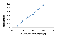 500 nm. Lower concentrations of the dye (5–30 mg/L) were prepared from the stock solution by serial dilution with deionized water and absorbance readings taken with the UV–Visible spectrophotometer at a λmax value of 500 nm [6]. The graph of absorbance against concentration was plotted to give the calibration curve (Figure 1).