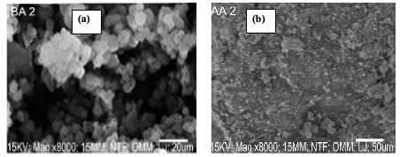 The surface morphology showed the presence of voids in-between the particles before adsorption while the image after adsorption shows the incorporation of the dye into the voids in-between the particles (Figure 2b).