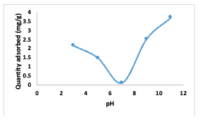 The quantity of adsorbent used in the experiment was adjusted, ranging from 0.01to 0.05 g. It was observed that as the amount of adsorbent increased, the quantity adsorbed decreased. This can be attributed to anagglomeration of the adsorbent particles due to the increased quantity of adsorbents employed [10,14,18].