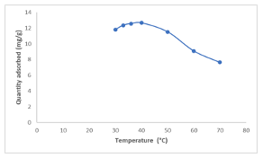 The effect of temperature change on the adsorption process was monitored using 0.01 g of the adsorbent for this study. The temperature was varied within the range of 30 to 70°C, and each experiment lasted for 4 hours.