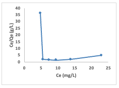 The Langmuir adsorption isotherm (equation2) was studied by plotting a graph of Ce/Qeagainst
