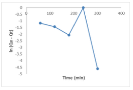 The Lagergren model (equation 6)parameters for the uptake of Congo red dye by the [Cu(BTCA)(AMB)] absorbent was derived by plotting ln (qe−qt) against time from the linearized form of the equation given below.