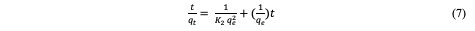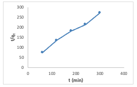 Both the equilibrium adsorption capacity(Qe) and the rate constant (k2) were computed by extracting these values from the slope and intercept, respectively. The Qe and k2 values were calculated to be 1.27 and 0.018, respectively. The pseudo-second-order model proves its applicability to the adsorption experiment due to the high correlation coefficient (R2) value of 0.99 obtained, and also indicates it best explains the adsorption process [17]. The linearized form of the pseudo-second order rate equation (7) is given as:
