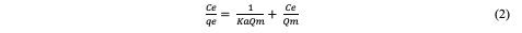The linear form of the Langmuir model and the equation used in calculating the separation factor (RL) (equation 3) are given in equations below:
