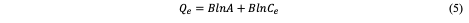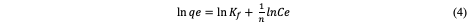 where Ka (L/mg) is the Langmuir constant, and Co (mg/L) is the initial concentration.The adsorption process can be determined as favorable when the RL value lies between 0 and 1. The Qm value was found to be -0.6922 and the constant Ka to be -0.09. The RL was calculated to be -0.8, which falls below 0 and indicates unfavorable adsorption, while theR2 value was obtained as 0.1166.The relationship of the amount adsorbed per unit mass or mole with concentration is demonstrated by the Freundlich model (equation 4) given as: