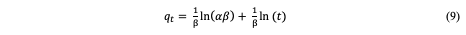 However, it's worth noting that the correlation coefficients (R2) were found to be high with a value of 0.9389, indicating that this model is suitable for an assessment of the adsorption process [17]. The linearized equation (9) for the Elovich kinetic model is given as: