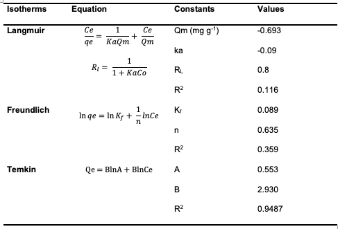To assess the adsorption of congo red dyeover [Cu(BTCA)(AMB)], three different models, Langmuir, Freundlich, and Temkin,were employed in an effort to determine which isotherm model best describes the adsorption process [8]. The parameters obtained from subjecting the adsorption data to the various isotherm models are given in Table 1.