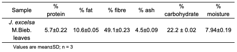 Carbohydrates are useful as they supply energy to cells such as brain, muscles and blood. They contribute to fat metabolism and spare proteins as an energy source and act as a mild laxative for human beings. They generally add to the bulk of the diet [26,27]. The protein content of the leaves shows the plant is a good protein supplement for animal feed [26], however, the content is not as high as the 12.5% reported for Nauclea latifolia leaves, 20.42% for Moringa leaves and 14.73% for Ageratum conyzoides leaves [25-27]. The fat content (10.6% for the leaves of J. excelsa M.Bieb.) is low and compares with the results for Agbafor et al. (2015) and Eze et al. (2014), who concluded that the leaves of Ageratum conyzoides are poor sources of lipids [25,26]. Our results agree with Dike et al. (2016) [28]. The total moisture content is considered low, and this low moisture content of the leaves indicates that the plant materials can be stored over a long period with lesser susceptibility to microbial attack [28]. The total ash content of the plant materials is low (4.5%) indicating low total mineral elements in the plant materials [29].